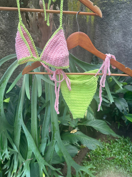 Taffy pink and bright green tie bikini. Adjustable bottom, wear flat or scrunch for an extra cute shape. Handmade from cotton and bamboo yarn!