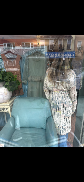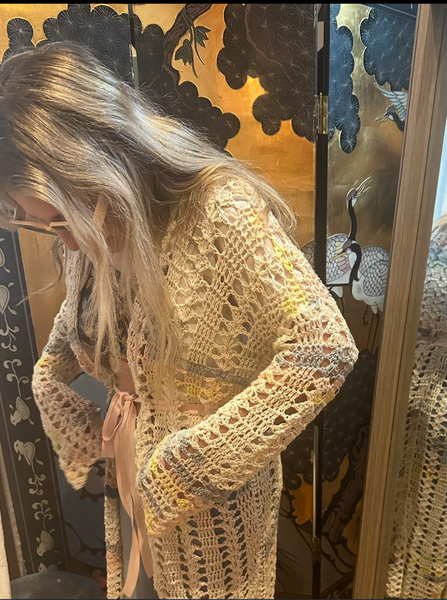 Featherweight intricate knit duster. Creamy and silky cotton dk cream yarn with swirls of pastel pinks, blues, and yellows, and a pink ribbon tie.